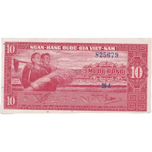 | 表面の銘文 | NGÂN-HÀNG QUỐC-GIA VIỆT-NAM MƯỜI ĐỒNG 10 THỦ-QUỸ TRUNG ƯƠNG TỔNG-KIỂM-TRA VIỆT-NAM (Translation: National Bank of the State of Vietnam. Ten đồng. 10. Central Cashier. Chief Inspector. Vietnam.) |