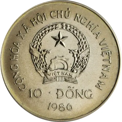 表面の銘文 CỘNG HÒA XÃ HỘI CHỦ NGHĨA VIỆT NAM 10 . ĐỒNG 1986