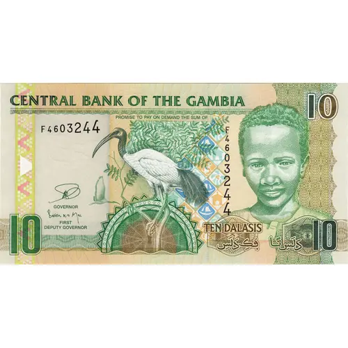 Leyenda del anverso CENTRAL BANK OF GAMBIA 10 TEN DALASIS