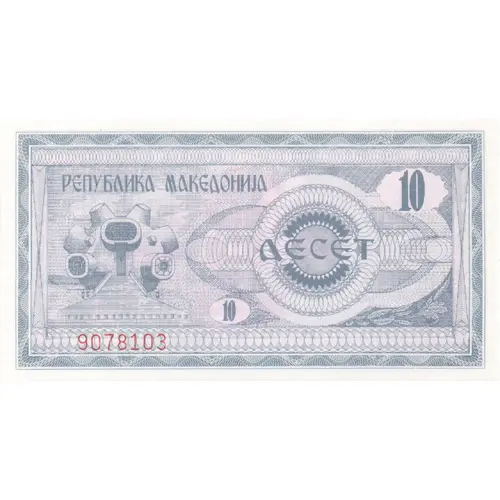 | Legenda del rovescio | СКОПЈЕ 1992 ГОДИНА ФАЛСИФИКУВАЊЕТО СЕ КАЗНУВА СПОРЕД ЗАКОНОТ НАРОДНА БАНКА НА МАКЕДОНИЈА ДЕСЕТ 10 (Translation: Skopje year 1992, Falsification is punishable by law, National Bank of Macedonia, Ten) |