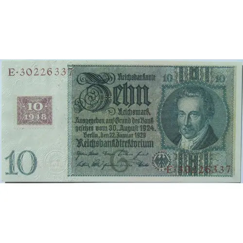 | نوشتههای روی اسکناس | Reichsbanksnote 10 10 Zehn Reichsmark - 10 - 1948 Ausgegeben auf Grund des Bank- gesetzes vom 30. August 1924. Berlin, den 22. Januar 1929 Reichsbankdirektorium 10 (Translation: Reichsbank note Ten Reichsmark Issued under the law of the bank from the 30th of August, 1924. Berlin, 22nd of January 1929. Reichsbank directory) |