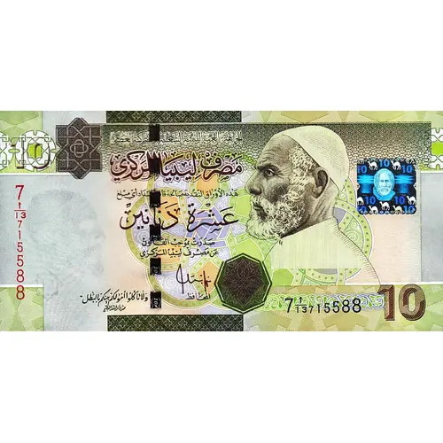 | Légende de l’avers | مصرف ليبيا المركزي عشرة دنانير 10 (Translation: Central Bank of Libya Ten Dinars) |