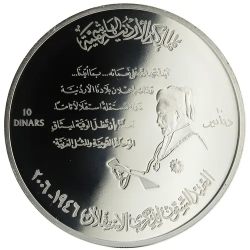 ِالمملَكةِ الأردُنيةِ الهَاشِميَّة أبدأ بحَمد الله عَلى نَعمَائه ... بمَا أيدنَا... وَذلك بإعْلان بلَادنا الأردنيَّة ،دَولة مُستَقلة استقلَالاً تامّاً ِنَعتَزّ بأن تَظلَ الوَفيَة لميثَاق الوَحدَةِ القَوميًّةِ وللمثُل العَرَبيَّة 10 ١٠ DINARS دنانير العيد السِّتّون لِذِكرَى الاستِقلال ١٩٤٦-٢٠٠٦ (Translation: The Hashemite Kingdom of Jordan `I begin by praising Allah (God) for his blessings... of supporting us... and that`s by the declaration of our Jordanian country a fully independent state we are proud to remain loyal to the Charter of Nationalism Unity and Arabic Ideals` 10 Dinars The Anniversary of Independence 1946-2006) |