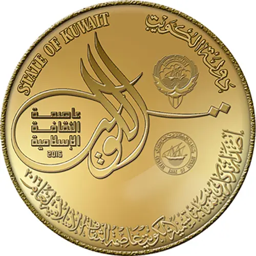 STATE OF KUWAIT دَولَة الكُوَيت دولة الكويت الكويت عاصمة الثقافة الإسلامية 2016 بنك الكويت المركزي CENTRAL BANK OF KUWAIT إصدار تذكاري بمناسبة تسمية الكويت عاصمة الثقافة الإسلامية لعامـ ٢٠١٦ (Translation: State of Kuwait Kuwait Capital of Islamic Culture 2016 Central Bank of Kuwait Commemorative issue for the occasion of naming Kuwait the Capital of Islamic Culture for the year 2016) |