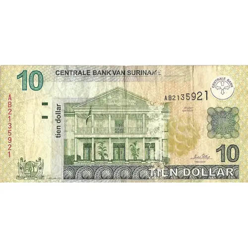 | نوشتههای پشت اسکناس | CENTRALE BANK VAN SURINAME Tabebuia serratifolia Suriname river TIEN DOLLAR NADRUK VERBODEN: SURINAAMS WETBOEK VAN STRAFRECHT ARTIKEL 260 (Translation: Central Bank of Suriname Tabebuia serratifolia Suriname river Ten Dollars Counterfeiting Forbidden: Suriname Criminal Law, Article 260) |