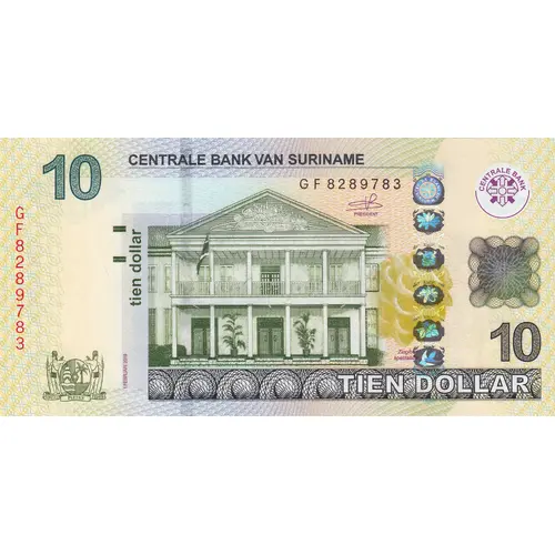 | نوشتههای پشت اسکناس | CENTRALE BANK VAN SURINAME Tabebuia serratifolia Suriname river TIEN DOLLAR NADRUK VERBODEN: SURINAAMS WETBOEK VAN STRAFRECHT ARTIKEL 260 (Translation: Central Bank of Suriname Tabebuia serratifolia Suriname river Ten Dollars Counterfeiting Forbidden: Suriname Criminal Law, Article 260) |