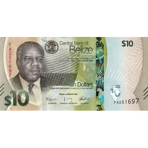 Central Bank of Belize ISSUED UNDER AUTHORITY OF THE CENTRAL BANK OF BELIZE ACT. 1982 Ten Dollars LEGAL TENDER FOR THE PAYMENT IN BELIZE OF ANY AMOUNT BELIZE, 1st. FEBRUARY 2025 $10 |