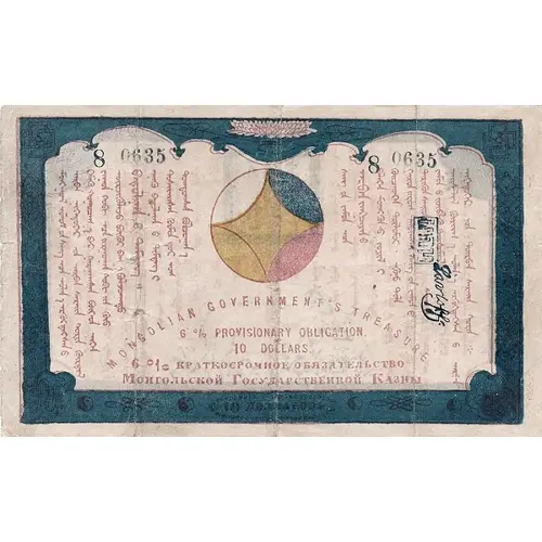 | Obverse lettering | ᠮᠣᠩᠭᠣᠯ ᠤᠯᠤᠰ ᠤᠨ ᠰᠠᠩ ᠠᠴᠠ ᠣᠯᠠᠨᠠ ᠡᠷᠭᠦᠭᠳᠡᠭᠰᠡᠨ ᠦ ᠠᠷᠪᠠᠨ ᠨᠢᠭᠡᠳᠦᠭᠡᠷ ᠣᠨ ᠠᠷᠪᠠᠨ ᠰᠠᠷᠠ ᠶᠢᠨ ᠬᠣᠷᠢᠨ ᠬᠦᠷᠲᠡᠯᠡ ᠬᠡᠮᠡᠬᠦ ᠬᠤᠭᠤᠴᠠᠭᠠ ᠪᠠᠷ ᠭᠠᠷᠭᠠᠭᠰᠠᠨ ᠪᠦᠭᠦᠳᠡ ᠨᠢᠭᠡᠨ ᠵᠠᠭᠤᠨ ᠬᠤᠪᠢ ᠠᠴᠠ ᠵᠢᠷᠭᠤᠭᠠᠨ ᠬᠤᠪ ᠤᠨ ᠬᠡᠦ ᠦᠷᠡᠵᠢᠭᠦᠯᠵᠦ ᠪᠦᠬᠦᠢ ᠪᠠᠭᠠ ᠪᠣᠯᠵᠣᠭᠠᠲᠤ ᠪᠠᠲᠤᠯᠠᠭᠠᠨ ᠤ ᠲᠡᠮᠳᠡᠭ᠃ ᠡᠨᠡᠬᠦ ᠪᠠᠲᠤᠯᠠᠭᠠᠨ ᠤ ᠲᠡᠮᠳᠡᠭ ᠢ ᠲᠤᠰᠢᠶᠠᠭᠰᠠᠨ ᠬᠦᠨᠳᠦ ᠤᠭ ᠲᠣᠭᠲᠠᠭᠰᠠᠨ ᠪᠣᠯᠵᠣᠭᠠ ᠰᠠᠩ ᠤᠨ ᠶᠠᠮᠤᠨ ᠠᠴᠠ ᠠᠷᠪᠠᠨ ᠶᠠᠩᠴᠢᠶᠠᠨ ᠤ ᠪᠡᠯᠡᠨ ᠮᠥᠩᠭᠥᠨ ᠦ ᠵᠦᠢᠯ ᠢ ᠭᠦᠢᠴᠡᠳᠭᠡᠨ ᠲᠥᠯᠮᠣᠢ᠃ ᠡᠭᠦᠨ ᠦ ᠲᠤᠯᠠ ᠭᠠᠷ ᠤᠨ ᠵᠢᠷᠤᠭ ᠲᠠᠯᠪᠢᠭᠰᠠᠨ ᠰᠠᠩ ᠤᠨ ᠶᠠᠮᠤᠨ ᠤ ᠲᠡᠷᠢᠭᠦᠨ ᠰᠠᠶᠢᠳ᠃ ᠰᠠᠩ ᠤᠨ ᠶᠠᠮᠤᠨ ᠤ ᠵᠦᠪᠳᠡᠬᠦ ᠲᠦᠰᠢᠮᠡᠯ᠃ ᠨᠡᠶᠢᠰᠯᠡᠯ ᠬᠦᠷᠢᠶᠡ᠃ ᠣᠯᠠᠨᠠ ᠡᠷᠭᠦᠭᠳᠡᠭᠰᠡᠨ ᠦ ᠠᠷᠪᠠᠨ ᠨᠢᠭᠡᠳᠦᠭᠡᠷ ᠣᠨ᠂ ᠳᠥᠷᠪᠡᠨ ᠰᠠᠷᠠ ᠶᠢᠨ ᠬᠣᠷᠢᠨ ᠅ MONGOLIAN GOVERNMENT`S TREASURE. 6 % PROVISIONARY OBLIGATION. 10 DOLLARS 6 % КРАТКОСРОЧНОЕ ОБЯЗАТЕЛЬСТВО МОНГОЛЬСКОЙ ГОСУДАРСТВЕННОЙ КАЗНЫ 10 ДОЛЛАРОВЪ (Translation: 6% short-term commitment to the Mongol State Treasure, 10 Dollars) |