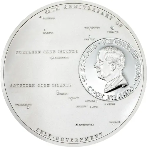 60TH ANNIVERSARY OF PUKAPUKA RAKAHANGA PENRHYN NASSAU MANIHIKI 10 DOLLARS · CHARLES III · 2025 DT · COOK ISLANDS · NORTHERN COOK ISLANDS SUWARROW SOUTHERN COOK ISLANDS AITUTAKI MANUAE MITIARO PALMERSTON TAKUTEA ATIU MAUKE RAROTONGA MANGAIA SELF-GOVERNMENT |