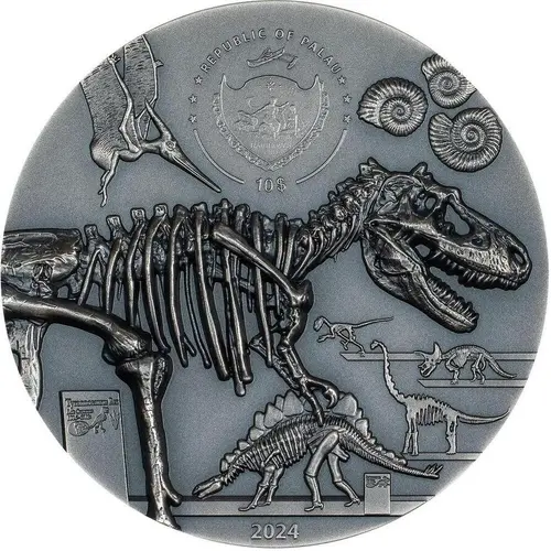 | Mô tả mặt trước | Coat of Arms of Palau with a modern museum scene featuring detailed dinosaur skeletons and namecards |