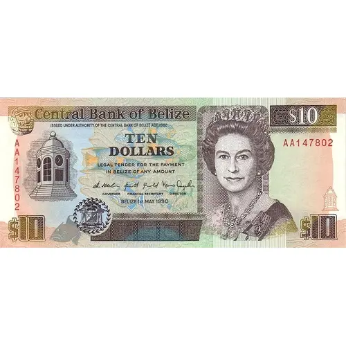 Central Bank of Belize ISSUED UNDER AUTHORITY OF THE CENTRAL BANK OF BELIZE ACT. 1982 TEN DOLLARS LEGAL TENDER FOR THE PAYMENT IN BELIZE OF ANY AMOUNT GOVERNOR FINANCIAL SECRETARY DIRECTOR BELIZE, 1st. JUNE 1991 SUB • UMBRA • FLOREO $10 (Translation: I flourish in the shade.) |