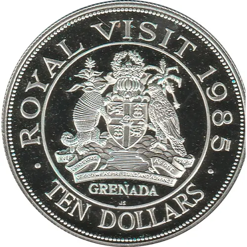 | Leyenda del anverso | ROYAL VISIT 1985 · TEN DOLLARS · GRENADA |