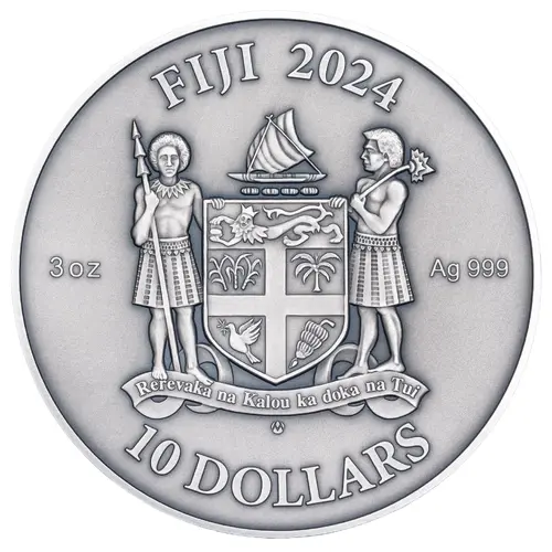 The obverse of the coin depicts the Coat of Arms of Fiji and the inscriptions: `FIJI` – the country of issue, `2024` – the year of issue, `3 oz Ag 999` – the weight of the coin and the fineness of the Silver and `10 DOLLARS` – the face value. |