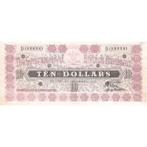 The Government of British Honduras PROMISE TO PAY THE BEARER ON DEMAND THE SUM OF TEN DOLLARS BELIZE, 1st DECEMBER, 1910 FOR THE GOVERNMENT OF BRITISH HONDURAS COMMISSIONERS OF CURRENCY 10 |
