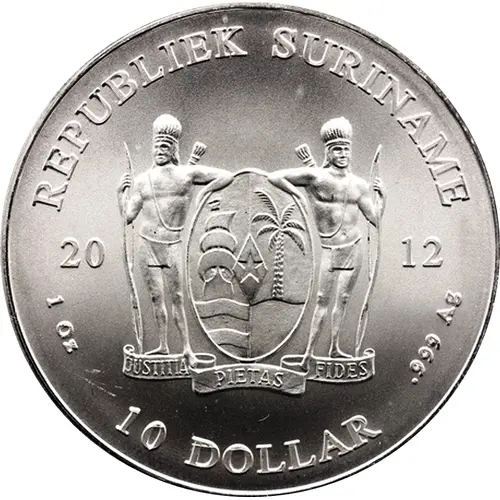 | Надписи аверса | REPUBLIEK SURINAME 2013 JUSTITIA PIETAS FIDES 1 Oz 10 DOLLAR .999 Ag (Translation: Republic of Suriname Justice Piety Faith) |