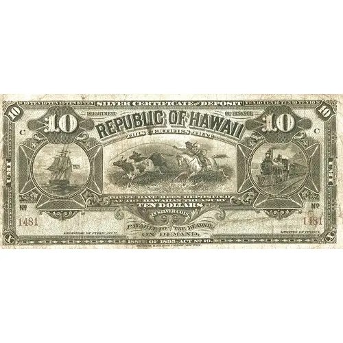 | Chữ khắc mặt trước | SILVER CERTIFICATE OF DEPOSIT UMI DEPARTMENT OF FINANCE REPUBLIC OF HAWAII THIS CERTIFIES, THAT THERE HAVE BEEN DEPOSITED AT THE HAWAIIAN TREASURY TEN DOLLARS IN SILVER COIN PAYABLE TO THE BEARER ON DEMAND. ISSUE OF 1895 - ACT № 19 |