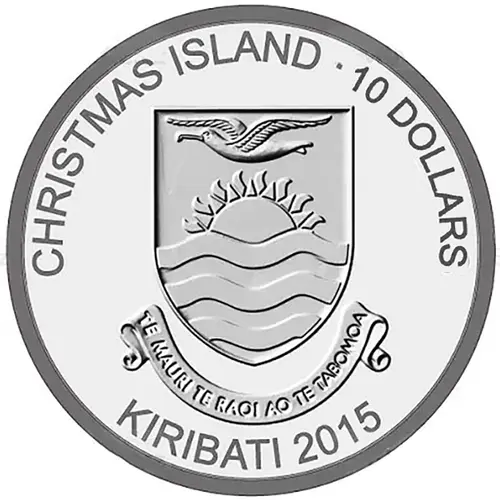 | Legenda del dritto | CHRISTMAS ISLAND · 10 DOLLARS TE MAURI TE RAOI AO TE TABOMOA KIRIBATI 2015 (Translation: Health, Peace and Prosperity) |