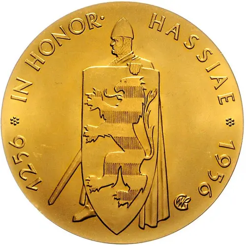 | Opis awersu | Knight with helmet, cloak and sword carries a man-sized shield with the coat of arms of Hesse, above it inscription and dates |