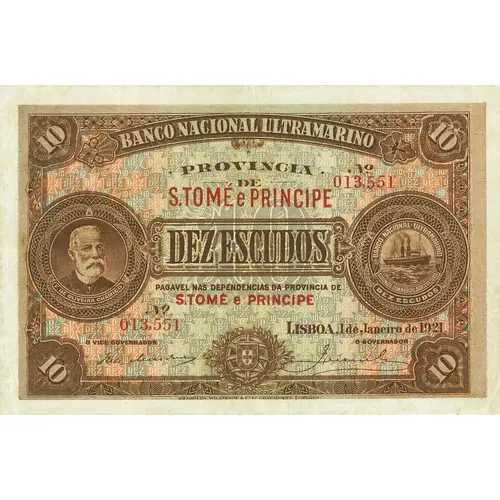 | Obverse lettering | BANCO NACIONAL ULTRAMARINO PROVINCIA DE S. TOMÉ e PRÍNCIPE DEZ ESCUDOS PAGAVEL NAS DEPENDENCIAS DA PROVINCIA DE S. TOMÉ e PRÍNCIPE LISBOA, 1 de Janeiro de 1921. BRADBURY, WILKINSON & & Co. Ld. GRAVADORES, LONDRES (Translation: National Bank Overseas Province of St. Thomas and Prince Ten Escudos Payable at the premises of the Province of St. Thomas and Prince Lisbon, January 1st, 1921. Bradbury, Wilkinson & Co. Ltd. Engravers, London) |