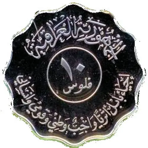 | Chữ khắc mặt trước | الجمهورية العراقية ١٠ فلوس احيا بابل اثريا واجب وطني وقومي وانساني (Translation: Republic of Iraq 10 Fils The restoration of Babel, a public and national responsibility) |