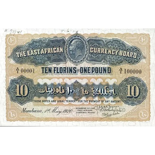 | Legenda del dritto | THE EAST AFRICAN CURRENCY BOARD TEN FLORINS OR ONE POUND THESE NOTES ARE LEGAL TENDER FOR THE PAYMENT OF ANY AMOUNT |