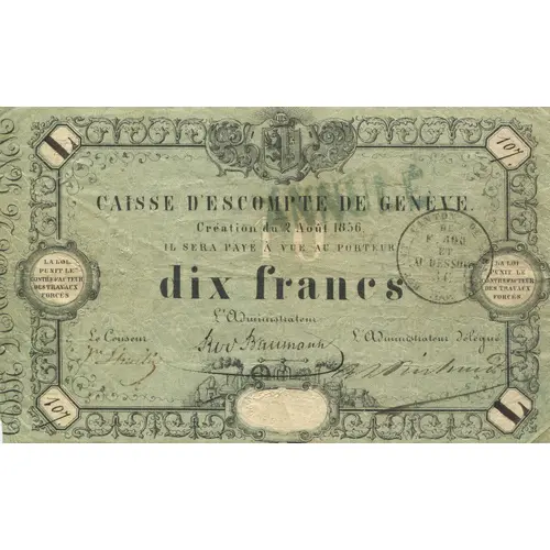 | Obverse lettering | CAISSE D`ESCOMPTE DE GENÈVE Création du 2 Août 1856 IL SERA PAYÉ À VUE AU PORTEUR dix francs LA LOI PUNIT LE CONTREFACTEUR DES TRAVUX FORCÉS Le Censeur : L`administrateur : L`administrateur délégué : |