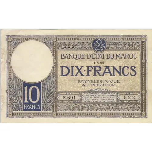 | Obverse lettering | BANQUE D`ÉTAT DU MAROC DIX FRANCS PAYABLE A VUE AU PORTEUR LEAS AUTEURS OU COMPLICES DE FALSIFICATION IU DE CONTREFAÇON DE BILLETS DE BANQUE, SERONT PUNIS CONFORMÉMENT AUX LOIS & ACTES EN VIGUEUR AD. GIRALDON FEC. RITA SC. |