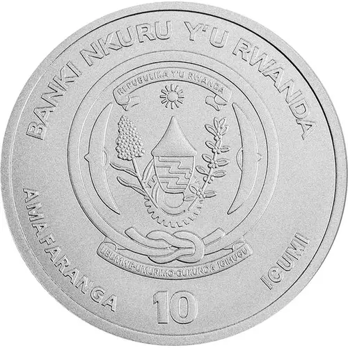 Obverse lettering BANKI NKURU Y`U RWANDA REPUBLIKA Y`U RWANDA UBUMWE UMURIMO GUKUNDA IGIHUGU AMAFARANGA 10 ICUMI
