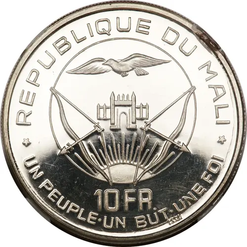 | Ön yüz lejandı | ⋆ REPUBLIQUE DU MALI ⋆ 10 FR. UN PEUPLE•UN BUT•UNE FOI ESSAI (Translation: Republic of Mali One People, One Goal, One Faith) |