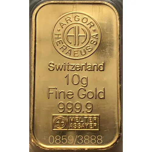 | Obverse lettering | ARGOR AH HERAEUS SWITZERLAND 10g Fine Gold 999.9 AH MELTED ASSAYER 0000/3888 |