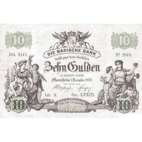 | Obverse lettering | 100 DIE BADISCHE BANK 100 bezahlt gegen diesen Bankschein Zehn Gulden IN BAAREM GELDE Mannheim, 1 December 1870. (Translation: 100 The Bank of Baden 100 Paid against this bank note Ten guilders In Cash Mannheim, December 1, 1870.) |