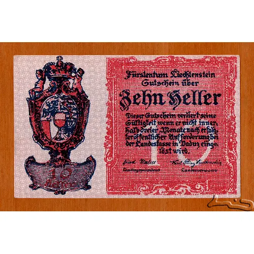 | Obverse lettering | Fürstenstum Liechtenstein Gutschein über Zehn heller Dieser Gutschein verliert seine Gültigkeit wenn er nicht inner, halb dreier Monate nach ersolg- seröffentlicher Nufforderungbei der Landeskasse in Vaduz einge- föst wird (Translation: Principality of Liechtenstein Coupon of Ten heller, This voucher loses its validity if he is not inside half three months after success public request cash in the state treasury in Vaduz) |