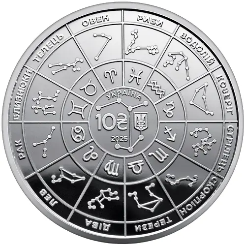 | Obverse lettering | ОВЕН ТЕЛЕЦЬ БЛИЗНЮКИ РАК ЛЕВ ДІВА ТЕРЕЗИ СКОРПІОН СТРІЛЕЦЬ КОЗЕРІГ ВОДОЛІЙ РИБИ УКРАЇНА 10₴ 2025 (Translation: Aries Taurus Gemini Cancer Leo Virgo Libra Scorpio Sagittarius Capricorn Aquarius Pisces) |