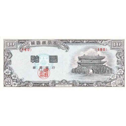 | Obverse lettering | 韓國銀行券 拾圜 韓國銀行 십 환 (Translation: Korean banknote, Ten Hwan, Bank of Korea, Ten Hwan) |