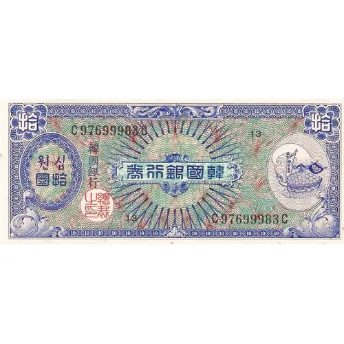 | Obverse lettering | 券行銀國韓 行銀國韓 원십 圜拾 (Translation: Korean banknote, The Bank of Korea, Ten Won, Ten Hwan) |