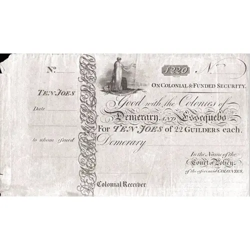 | 表面の銘文 | ON COLONIAL & FUNDED SECURITY Good with the Colonies Demerary and Essequebo For TEN JOES of 22 GUILDERS each Demerary In the Name of the Court of Policy of the aforesaid COLONIES Colonial Receiver (with counterfoil) |