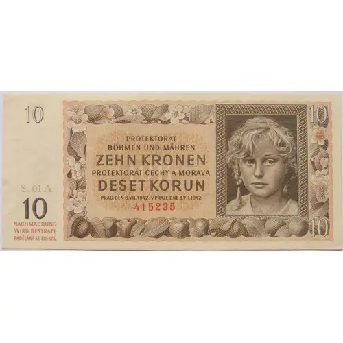 | Chữ khắc mặt trước | 10 10 PROTEKTORAT BÖHMEN UND MÄHREN ZEHN KRONEN PROTEKTORÁT ČECHY A MORAVA DESET KORUN PRAGUE, DEN 8. VII. 1942.-V PRAZE DNE 8.VII.1942. 415235 S. 01 A 10 NACHMACHUNG WIRD BESTRAFT. PADĚLÁNÍ SE TRESTÁ. (Translation: 10 10 PROTECTORATE OF BOHEMIA AND MORAVIA TEN CROWNS PROTECTORATE BOHEMIA AND MORAVIA TEN CROWNS PRAG, DEN 8. VII. 1942.-IN PRAGUE ON 8. VII.1942. 415235 S. 01 A 10 COUNTERFEIT WILL BE PUNISHED. COUNTERFEITING IS PUNISHED.) |