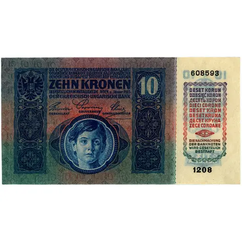 | Obverse lettering | DIE OESTERREICHISCHE-UNGARISCHE BANK ZAHLT GEGEN DIESE BANKNOTE BEI IHREN HAUPTANSTALTEN IN WIEN UND BUDAPEST SOFORT AUF VERLANGEN ZEHN KRONEN IN GESETZLICHEM METALLGELDE. WIEN, 2. Jänner 1915 OESTERREICHISCHE-UNGARISCHE BANK GENERALRAT GOUVERNEUR GENERALSEKRETÄR DESET KORUN ZECE COROANE DIE NACHMACHUNG DER BANKNOTEN WIRD GESETZLICH BESTRAFT (Translation: The Austro-Hungarian Bank will immediately pay ten crowns in lawful precious metal upon surrender of this banknote at its main offices in Vienna and Budapest. Wien, 2 January 1915. The Austro-Hungarian Bank General Council Governor Secretary General Ten crowns Counterfeiting of banknotes is punishable by law.) |