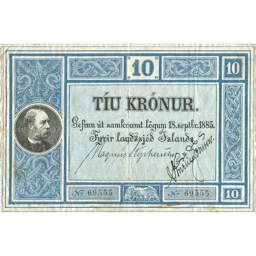 | Opis líce | TÍU KRÓNUR Gefinn út samkvæmt lögum 18.septbr.1885. Fyrir landssjód Islands |
