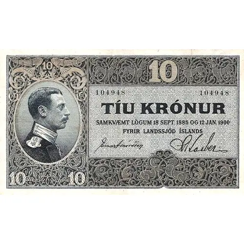 | 正面铭文 | TÍU KRÓNUR SAMKVÆMT LÖGUM 18 SEPT. 1885 OG 12 JAN. 1900. FYRIR LANDSSJÓD ÍSLANDS. (Translation: Ten Krónur Issued under the law of 18th of September and 12th of January.) |