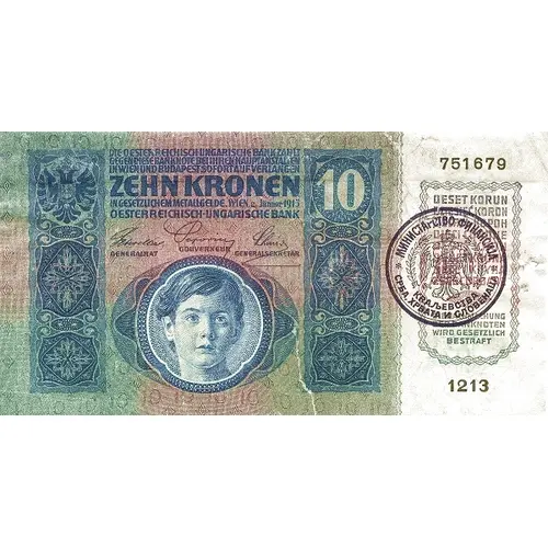 | Ön yüz açıklaması | Black round handstamp `Ministarstvo Financija` on Austria P#19 on the German side. |