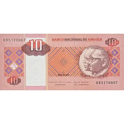| Obverse lettering | BANCO NACIONAL DE ANGOLA 10 A VITÓRIA É CERTA (Translation: National Bank of Angola, Victory is Certain) |