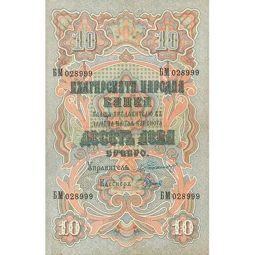 | Obverse lettering | Десетъ Лева Срѣбро Българската Народна Банка Плаща Прѣдѫвителю въ замѣна на таѫ банкнота (Translation: Ten Leva Silver The Bulgarian National Bank Pays the Bearer for exchange of this banknote) |