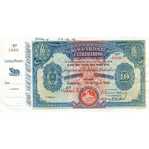 | Надписи лицевой стороны | BANCO NACIONAL ULTRAMARINO O THESOUREIRO DA FILIALA EM LOURENÇO MARQUES PAGARÁ Á VISTA AO PORTADOR DEZ LIBRAS ESTERLINAS OURO |