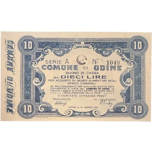 COMUNE DI UDINE BUONO DI CASSA DI DIECI LIRE PER ACQUISTO DI BENI ALIMENTARI NEGLI SPACCI COMUNALI SE NON CONSUMATO PER QUALSIASI MOTIVO SARA CONVERTITO A VISTA DAL COMUNE DI UDINE IN VALUTA LEGALE DI STATO ENTRO UN ANNO DALLA PROCLAMAZIONE DELLA PACE (Translation: MUNICIPALITY OF UDINE TEN LIRE CASH VOUCHER FOR THE PURCHASE OF FOOD IN THE MUNICIPAL OUTLETS IF NOT CONSUMED FOR ANY REASON IT WILL BE CONVERTED ON SIGHT BY THE MUNICIPALITY OF UDINE INTO LEGAL STATE CURRENCY WITHIN ONE YEAR OF THE PROCLAMATION OF PEACE) |