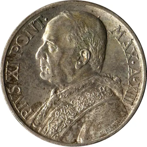 | Descrizione del dritto | Portrait of Pope Pius XI (1876-1958) with a caption indicating his name in Latin, his title of `Pontifex Maximus` (Supreme Pontiff) and the year of his pontificate |