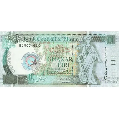 | Opis líce | Bank Ċentrali ta’ Malta Din il-karta tal-flus hija valuta legali għal GĦAXAR LIRI f`Malta u maħruġa bl-awtorità ta’ l-Att ta’ l-1967 tal-Bank Ċentrali ta’ Malta (Translation: Central Bank of Malta, This banknote is legal tender for Ten Liri in Malta and issued with the authority of the Central Bank of Malta Act of 1967) |