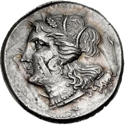 | Descripción del anverso | Head of Persephone left, wearing wreath of grain ears, single-pendant earring, and necklace; long torch to right. |