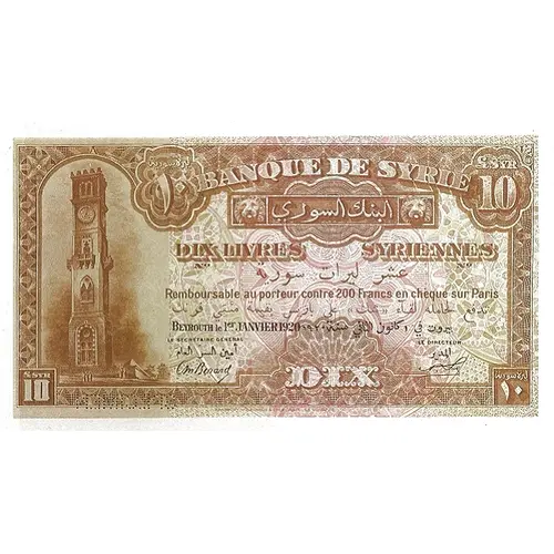 | نوشتههای روی اسکناس | BANQUE DE SYRIE DIX LIVRES SYRIENNES REMBOURSABLE AU PORTEUR CONTRE 200 FRANCS EN CHEQUE SUR PARIS |