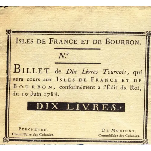 | Leyenda del anverso | ISLES DE FRANCE ET DE BOURBON BILLET DE DIX LIVRES TOURNOIS QUI AURA COURS AUX ISLES DE FRANCE ET DE BOURBON CONFORMEMENT AU EDIT DU ROI, DU 10 JUIN 1788 DIX LIVRES |